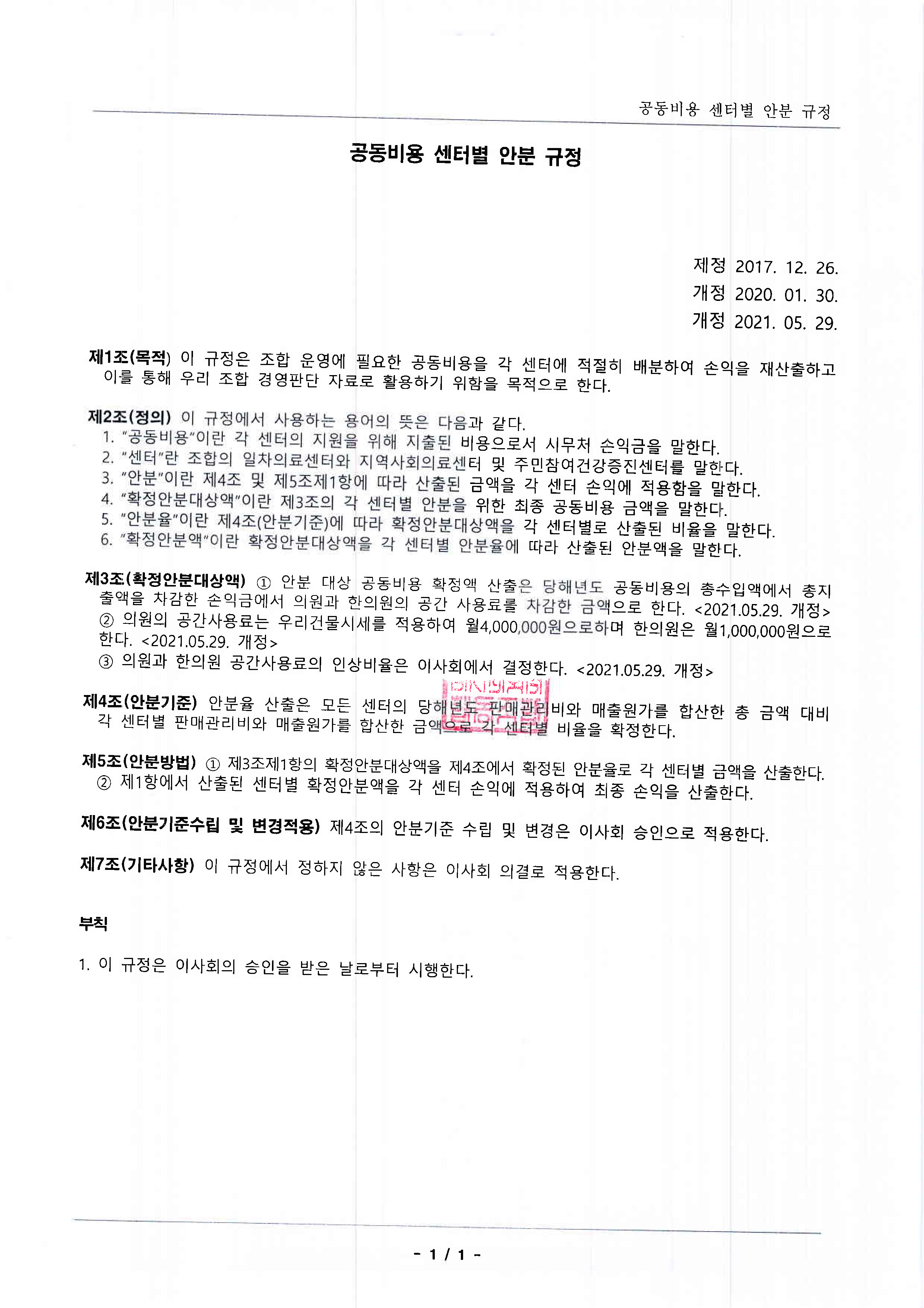 9. 공동비용 센터별 안분 규정(2020.5.29 개정)