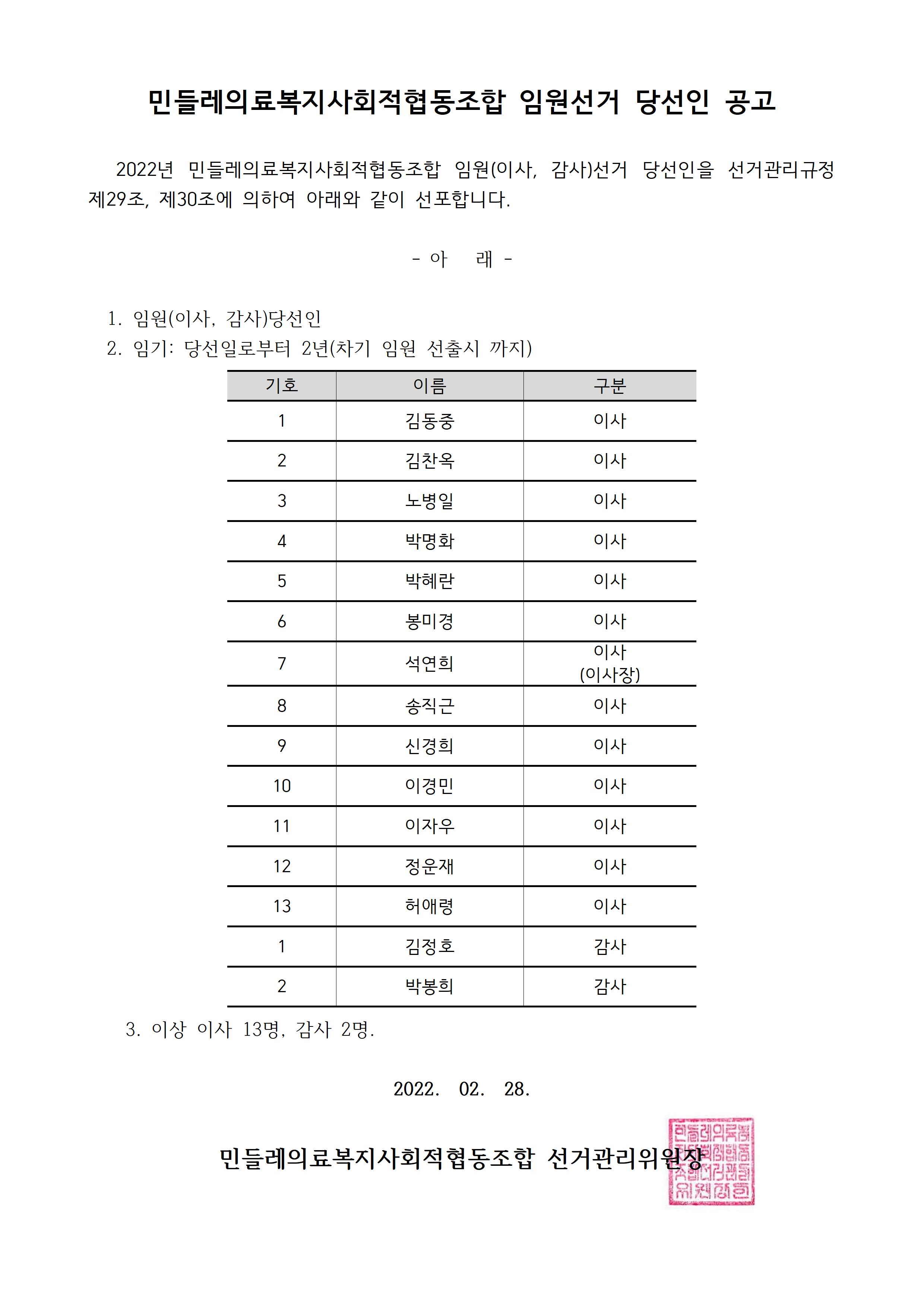 2022년 임원(이사, 감사)선거 당선인 공고