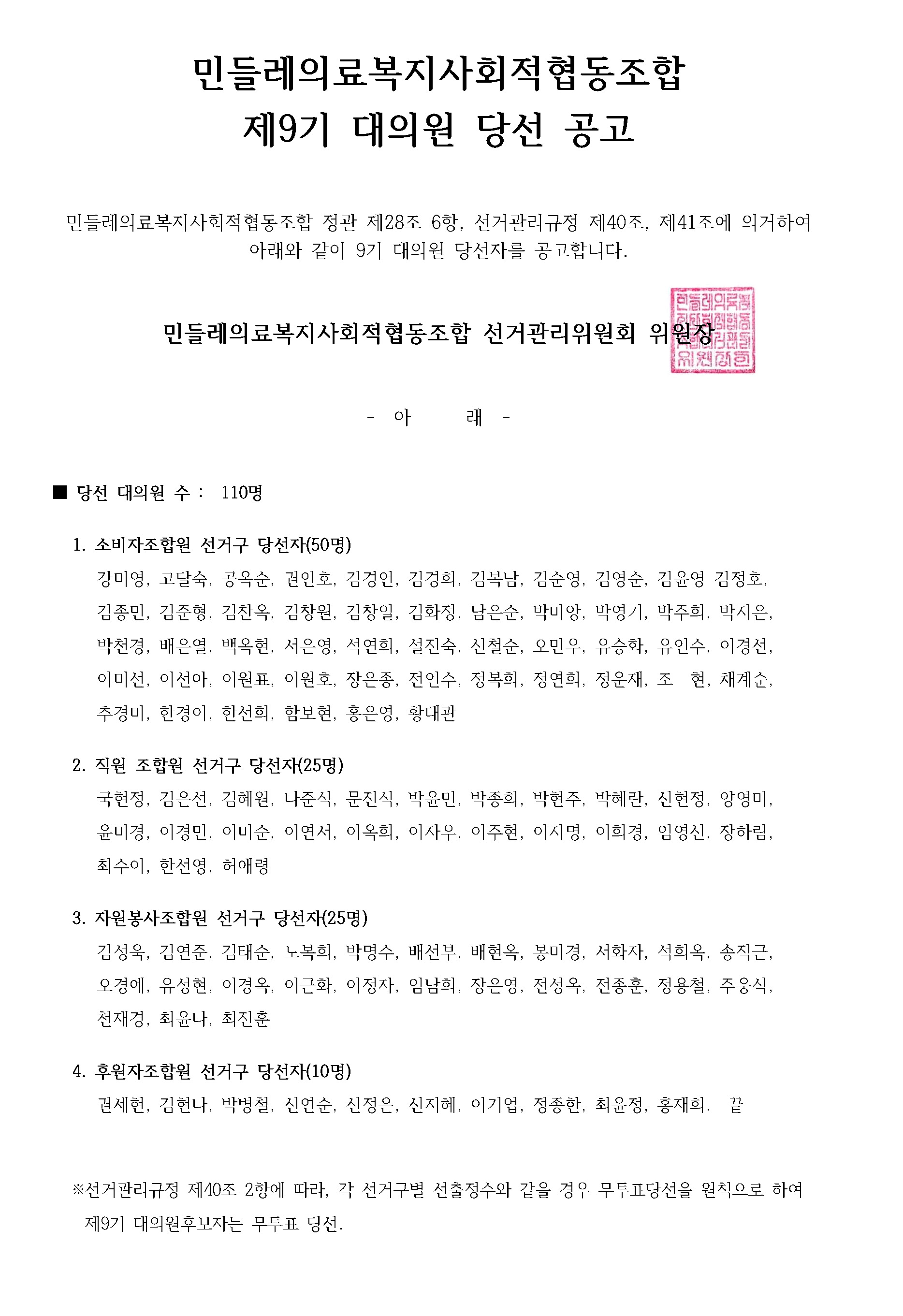 제9기 대의원 당선 공고